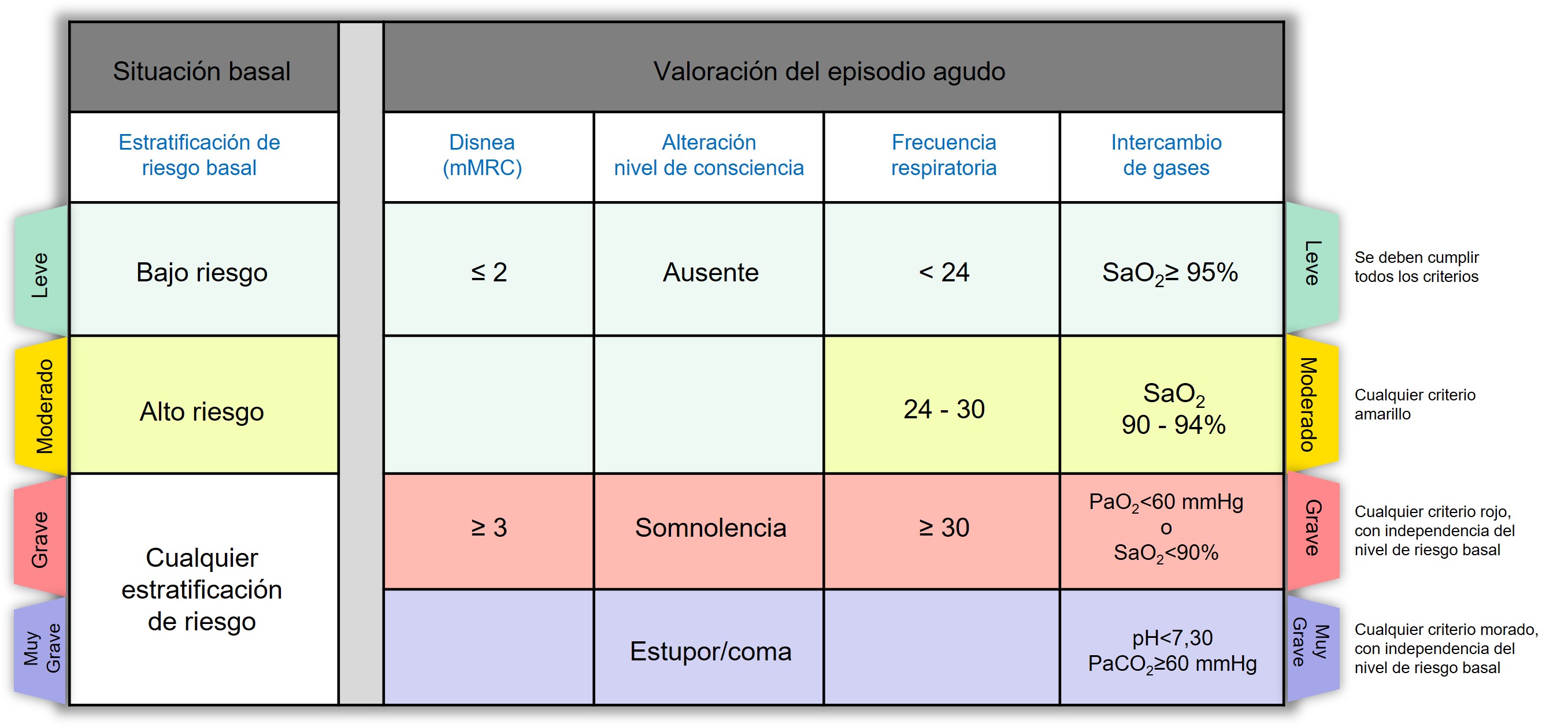 Una vez establecido el diagnóstico de SAE, es muy importante describir la gravedad del episodio, que en la mayoría de las ocasiones es el resultado de la interacción entre la enfermedad de base y la intensidad del episodio agudo. La figura 2 muestra los criterios de gravedad propuestos por GesEPOC. La estratificación de riesgo basal se realizará de acuerdo con la última actualización de GesEPOC 2021 para la fase estable de la enfermedad (4), mientras que la gravedad del episodio será evaluada de acorde al nivel de disnea, nivel de consciencia, frecuencia respiratoria e intercambio de gases.