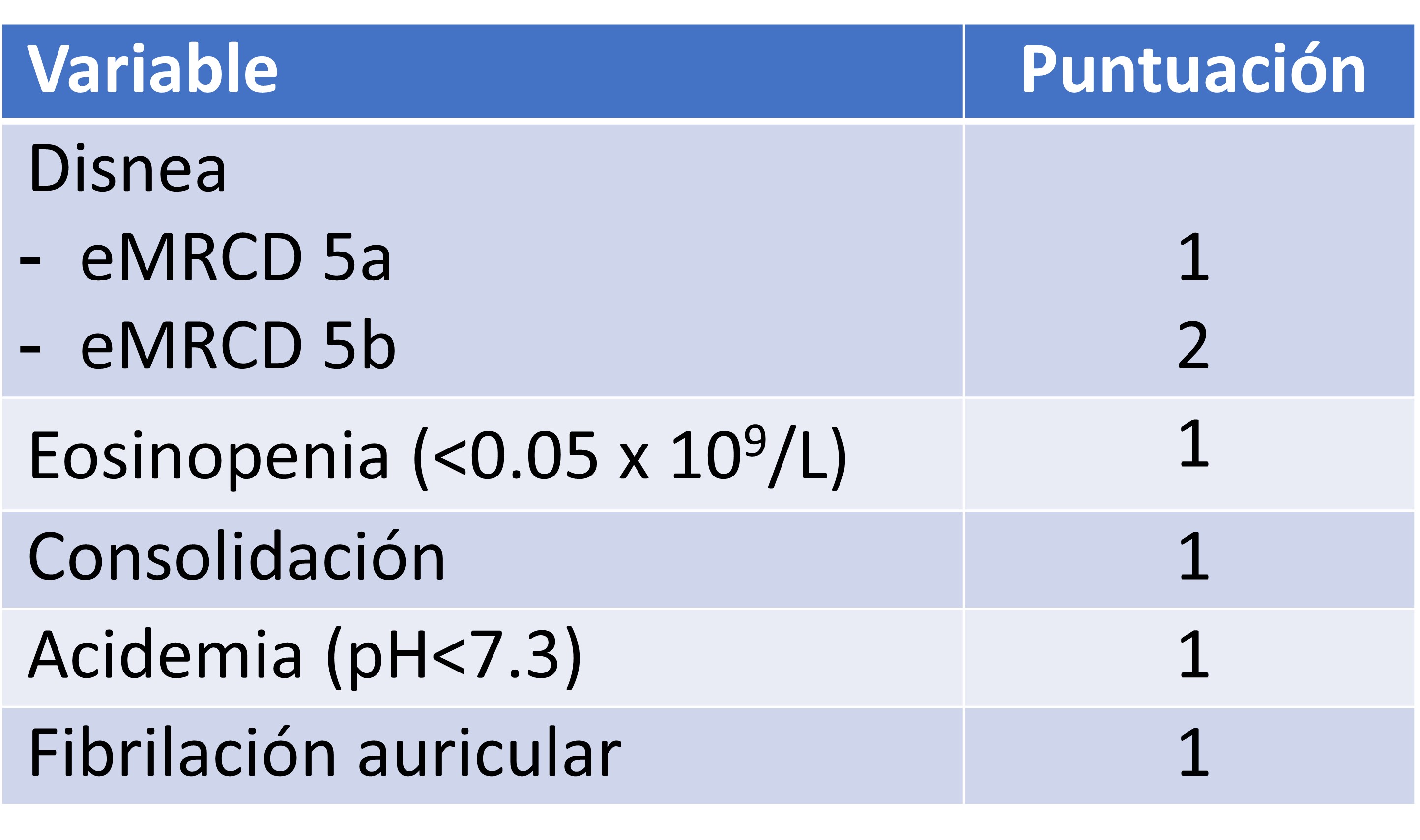 Disponer de escalas predictivas de riesgo puede ser de gran interés de cara a estratificar a los pacientes y a diseñar circuitos asistenciales de diferente intensidad y/o complejidad (18-23). Uno de escalas más estudiadas es el índice DECAF, desarrollado por Steer et al (20) en pacientes hospitalizados por SAE, a partir de los cinco predictores de mortalidad con más peso específico (Disnea basal, Eosinopenia, Consolidación, Acidemia y Fibrilación auricular) (tabla 3). Este índice ha demostrado una excelente discriminación para mortalidad, siendo más preciso que otros predictores clínicos de mortalidad (20-23). En los pacientes con riesgo bajo (0-1 puntos), la mortalidad intrahospitalaria fue del 0,5 – 2,1% y la mortalidad a los 30 días osciló entre el 1,5 – 3,8%, para los casos de riesgo intermedio (2 puntos) la mortalidad intrahospitalaria fue del 8,4% y a los 30 días, del 11,9%. Los pacientes con DECAF³3 puntos presentaron una mortalidad intrahospitalaria del 24 – 70% y a los 30 días osciló del 27,2 – 70% (17). GesEPOC recomienda el uso adicional de escalas predictivas de riesgo, como el índice DECAF, en pacientes con SAE hospitalario (grave o muy grave).