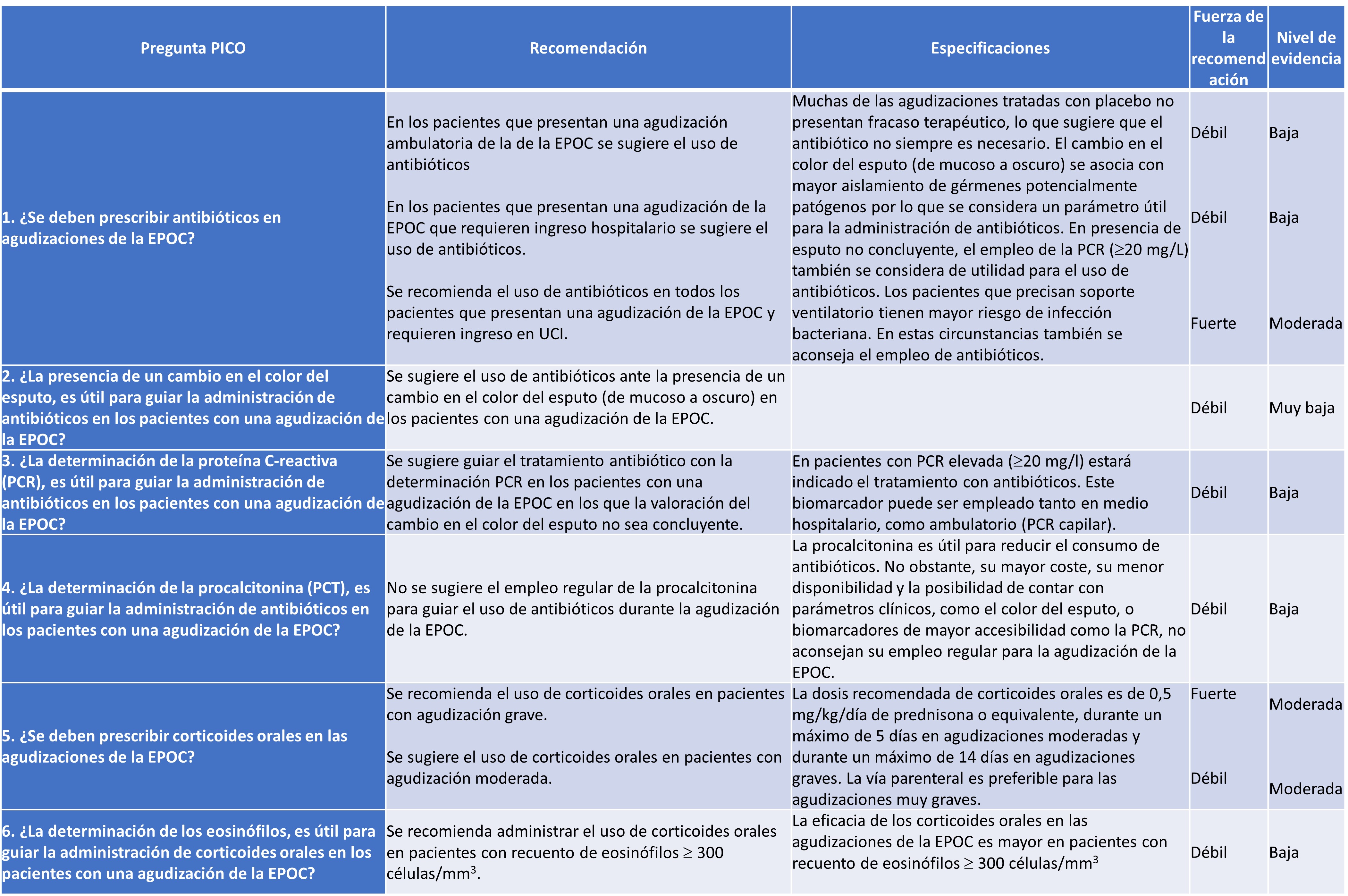 Existe una gran actividad de investigación sobre biomarcadores de infección bacteriana en el SAE. La revisión sistemática realizada por esta guía, centrada en la agudización tradicional de la EPOC y en la que se excluye la neumonía, señala que tanto la proteína C-reactiva (PCR) como la procalcitonina (PCT) son útiles para guiar el tratamiento antibiótico asociándose a una menor prescripción de este tipo de fármacos, sin que se aprecien diferencias en la tasa de fracasos terapéuticos, recurrencias, hospitalizaciones o mortalidad (tabla 5, anexo 1). La PCR puede ser evaluada tanto en medio hospitalario como ambulatorio, mediante determinación capilar (30,31). En pacientes con PCR elevada (≥20 mg/L), incluso con esputo no concluyente, se sugiere emplear antibióticos en pacientes con SAE (tabla 5, anexo 1). La procalcitonina también es útil para reducir el consumo de antibióticos (32). No obstante, su mayor coste, su menor disponibilidad y la posibilidad de contar con parámetros clínicos, como el color del esputo o biomarcadores de mayor accesibilidad como la PCR, no sugieren su empleo regular para la agudización de la EPOC (tabla 5, anexo 1). Tampoco se sugiere el uso de PCT en los casos con neumonía adquirida en la comunidad o de neumonía nosocomial (33,34)).